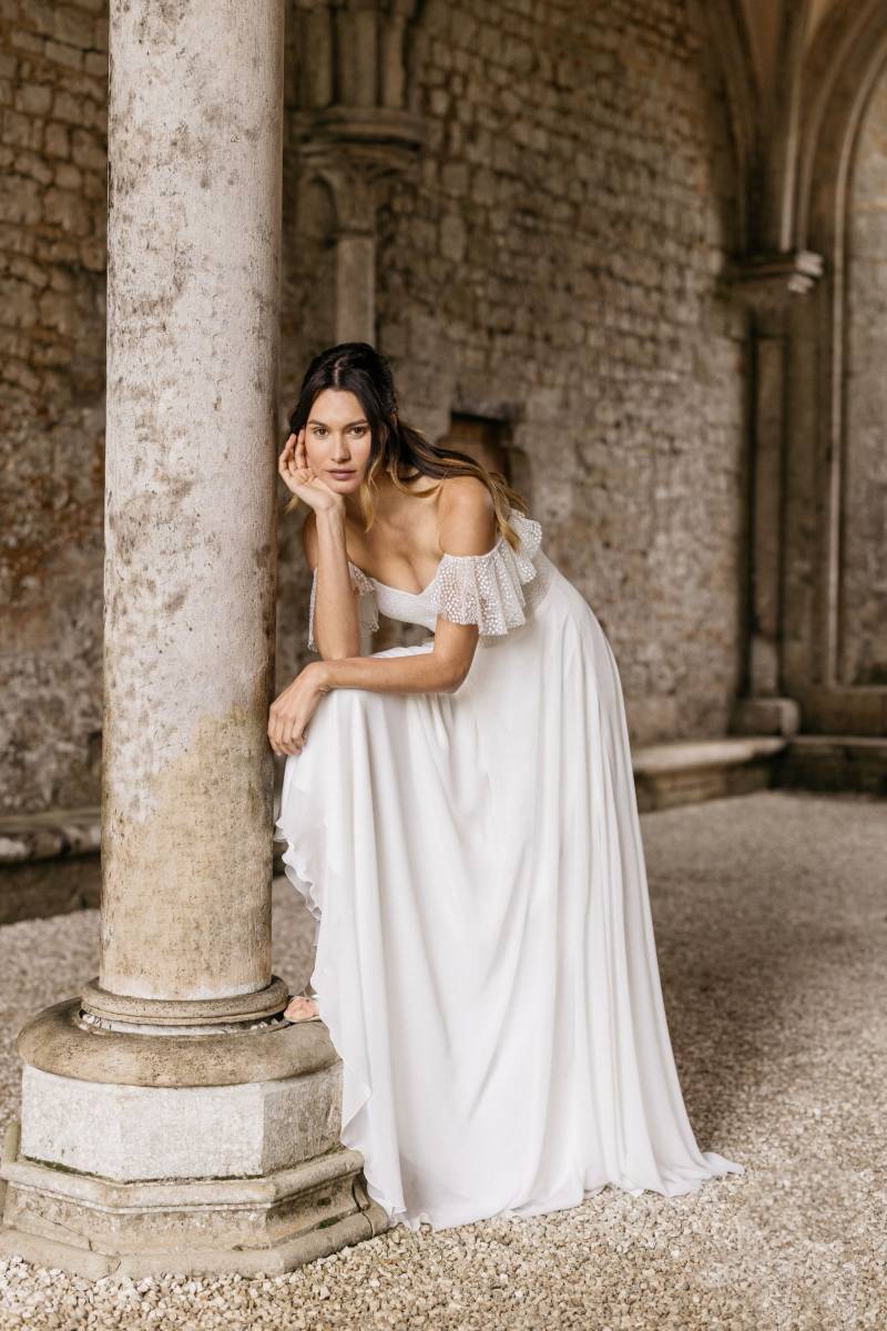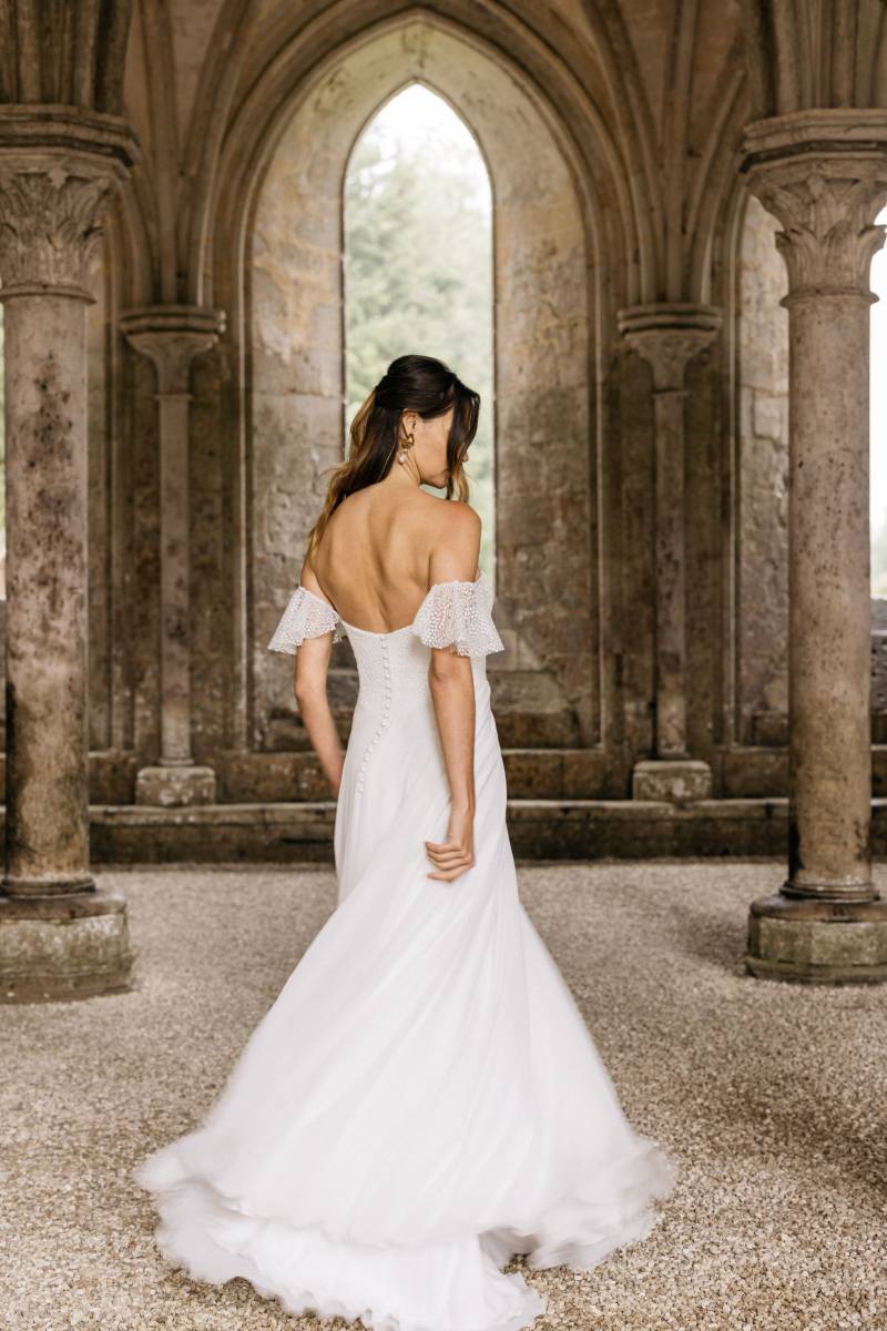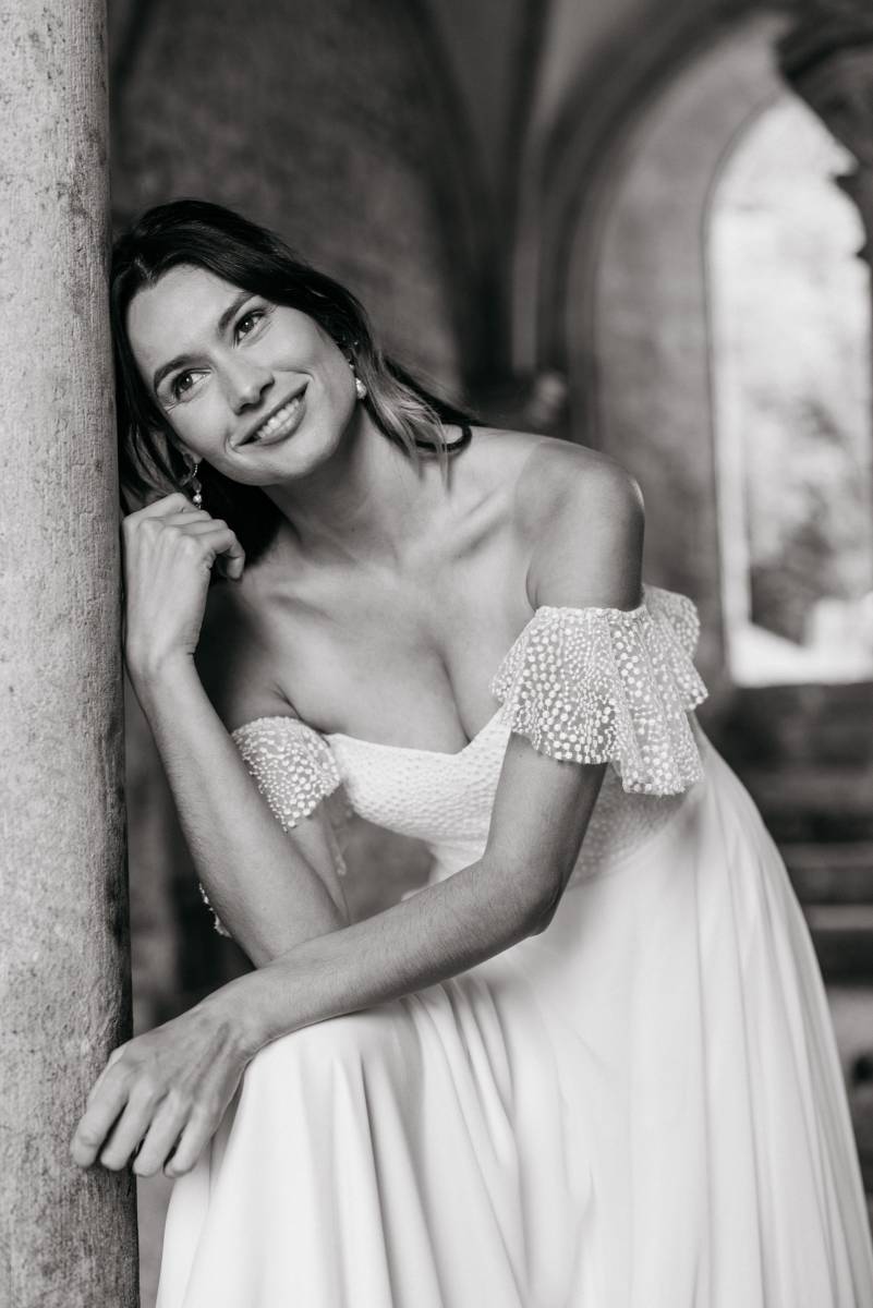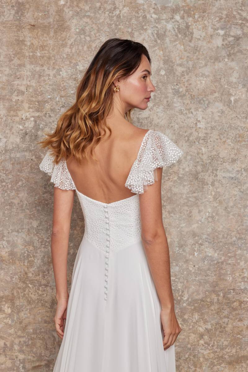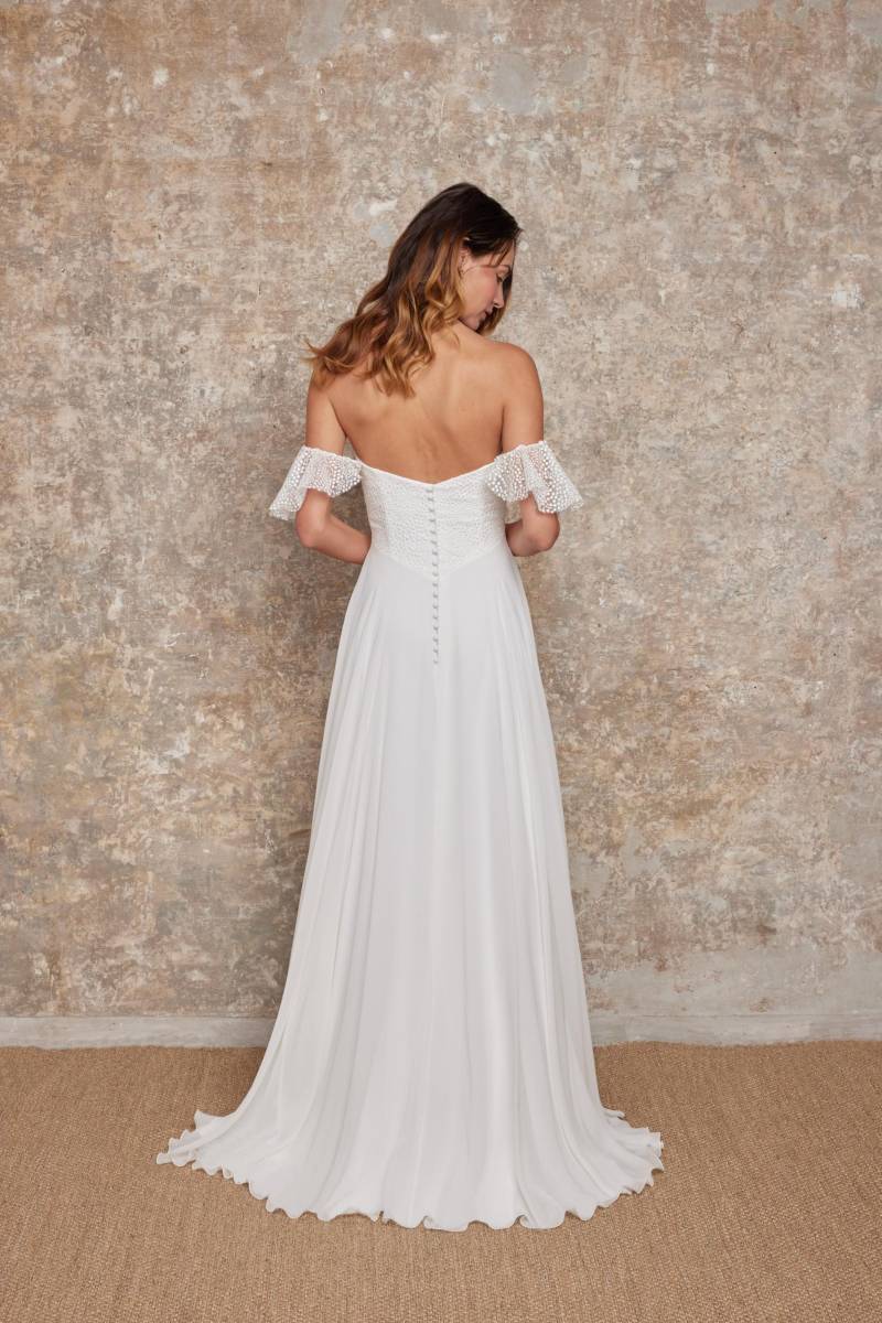 Aude est une robe de mariée bustier d'une élégance espiègle, dotée de bretelles amovibles astucieuses qui offrent une charmante polyvalence. Celles-ci peuvent se porter fièrement à la verticale, bien calées sur les épaules pour un maintien classique, ou délicatement tombantes sur le haut des bras, révélant une sensualité subtile. Confectionnée dans un plumetis délicat, un tissu léger et parsemé de pois brodés, elle respire la fraîcheur. Son style est résolument pimpant, frais, charmant, idéal pour des femmes féminines, modernes, romantiques qui recherchent une allure à la fois pétillante et douce. Avec les bretelles tombantes, Aude se métamorphose et prendra un style plus Lolita, teinté d'une innocence audacieuse et d'un romantisme juvénile.