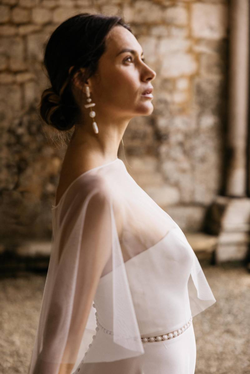 Son design épuré et moderne s'adapte à tous les styles de robes de mariée, du plus classique au plus bohème. La cape courte en tulle est idéale pour celles qui souhaitent apporter une touche personnelle à leur tenue sans en faire trop.
