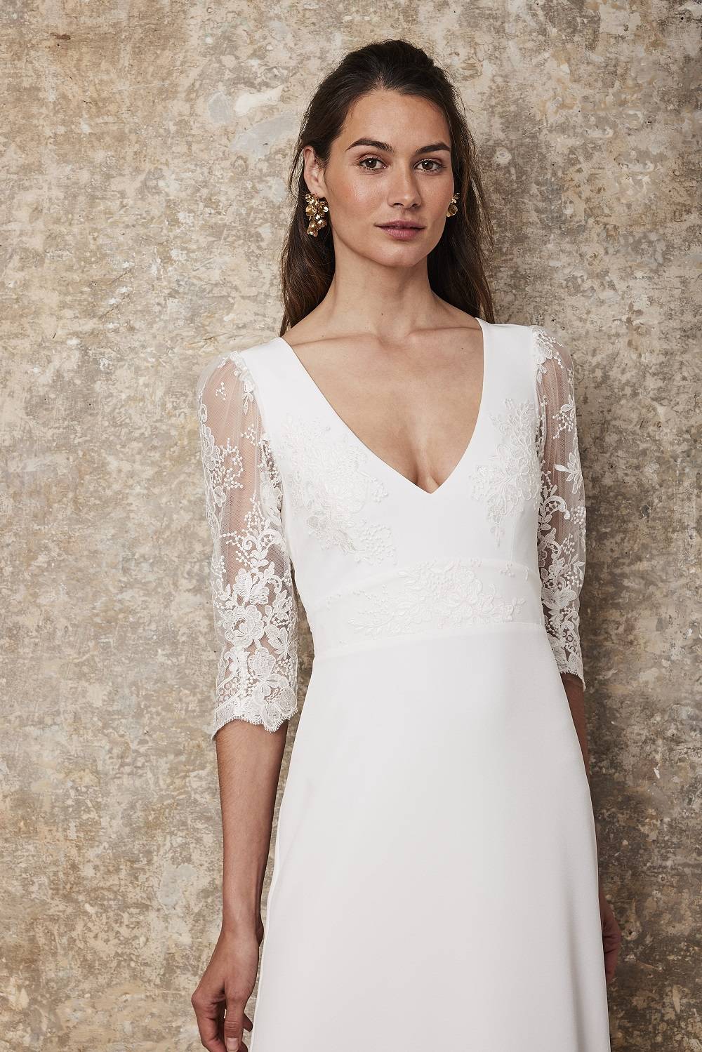 Les manches gigot trois-quarts ou manches longues, également en dentelle de Calais, apportent une touche de romantisme et d'élégance à la robe. Elles équilibrent subtilement la ligne de cette robe de mariée, créant une silhouette harmonieuse et féminine. Le décolleté dos, entièrement en dentelle, est fermé par de petits boutons délicats, ajoutant une note de raffinement. Il peut également être proposé en V pour celles qui souhaitent une touche de modernité.