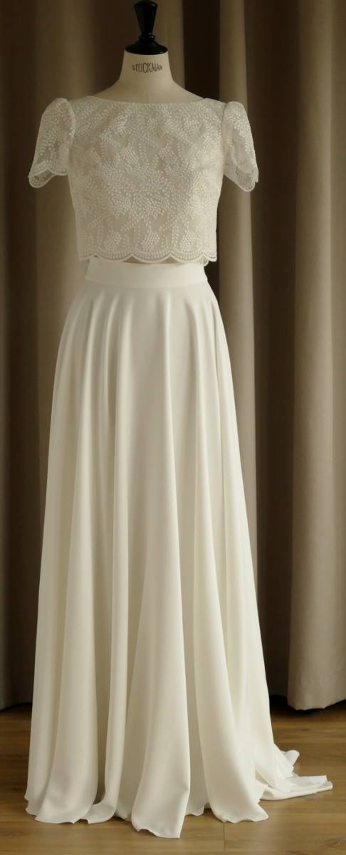 Le top Barbara, avec son col bateau délicat, met en valeur les épaules tout en finesse. Le dos, magnifiquement ajouré, est la pièce maîtresse de ce haut. Il est orné d'une délicate dentelle géométrique qui lui confère une touche de modernité. La jupe longue assortie, d'un tombé fluide et léger, garantit une silhouette gracieuse et un confort absolu tout au long de la journée, de l'émotion de la cérémonie jusqu'à l'effervescence de la soirée.