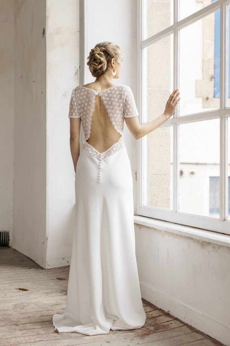 Le grand décolleté dos et la ligne de cette robe de mariée séduiront les femmes qui veulent une robe sensuelle. Ce décolleté dos en losange, avantagera tout particulièrement les femmes très cambrées.