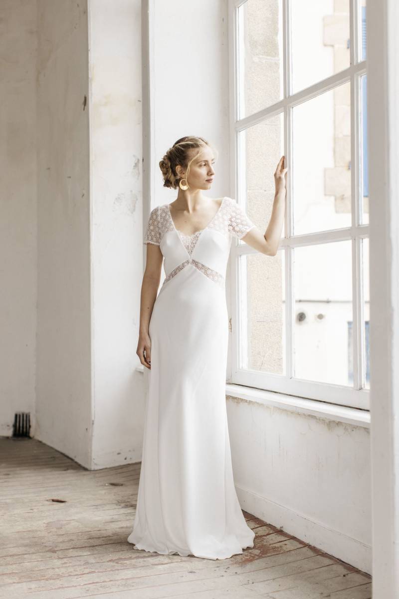 Sa ligne est fourreau, c'est-à-dire que la jupe est droite, et étroite, près du corps. Cette robe de mariée a la particularité d’être taillée tout en biais et donc de souligner la silhouette, de faire un effet seconde peau qui dévoile le corps.