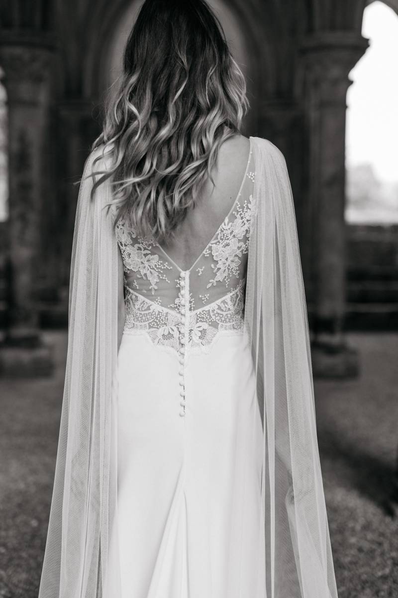 Isaure est une robe de mariée effet "seconde peau" qui épouse et magnifie les courbes naturelles. Son design moderne et glamour se révèle pleinement grâce à la possibilité d'ajouter des pans de tulle sur les épaules. Ces pans créent un effet de traîne vaporeuse et féérique, apportant une touche spectaculaire et contemporaine à votre allure. C'est une robe de mariée à assumer sans modération pour une mariée confiante et rayonnante.