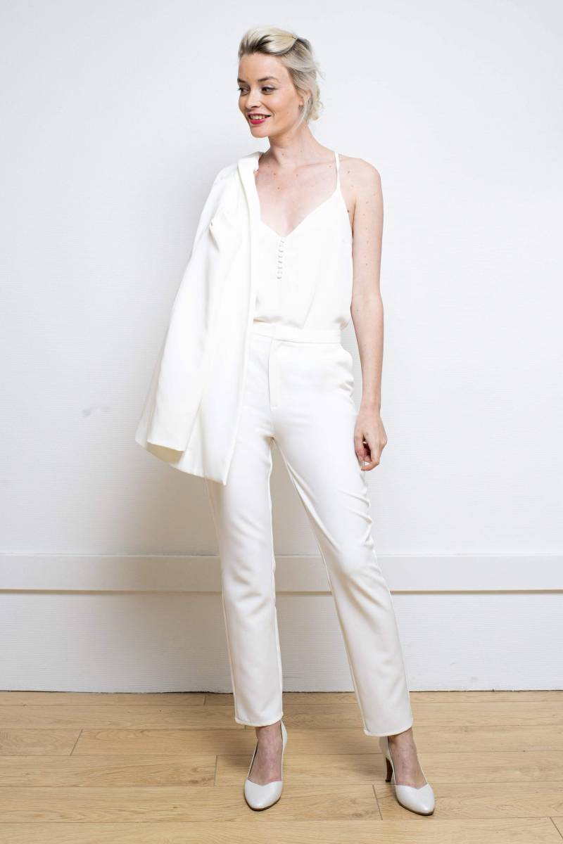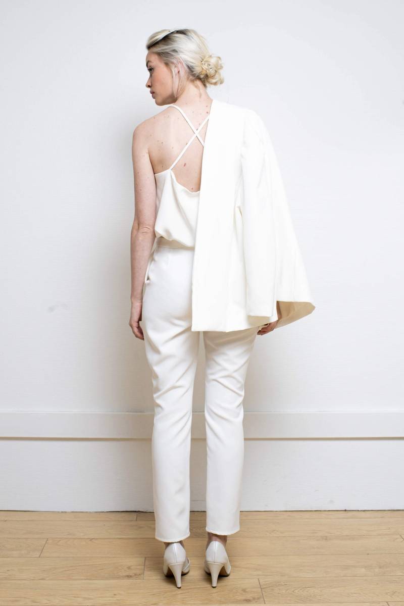 Au cœur de cette collection, découvrez la polyvalence d'un ensemble particulièrement ingénieux, composé de 3 pièces qui peuvent être commandées séparément. Cette modularité exceptionnelle vous permet de créer une silhouette nuptiale véritablement unique et de maximiser la réutilisation de chaque élément. Imaginez par exemple un délicat caraco en crêpe, une jupe fluide et aérienne, et peut-être un élégant pantalon palazzo assorti ou une sur-jupe vaporeuse pour varier les styles.