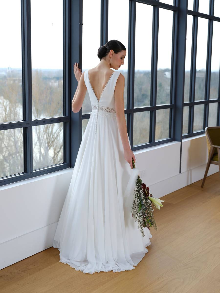 La robe Adèle séduit par sa poésie visuelle et son confort absolu. C’est la création parfaite pour une cérémonie empreinte de douceur, où l’élégance se lit dans chaque détail.