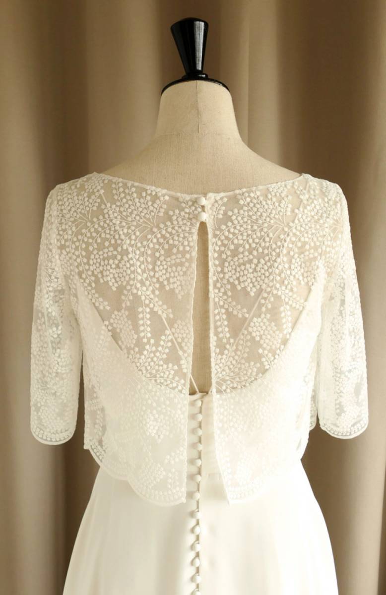 Sa grande force est sa polyvalence. Dans sa version transparente, non doublée, le Top Ivy Bo est conçu pour rehausser une robe de mariée simple et minimaliste. C'est un moyen facile et élégant de la transformer. Mais ce n'est pas tout ! Doublé, il peut aussi se porter avec une jupe droite pour un mariage civil, ou avec un pantalon pour un look de cérémonie audacieux.