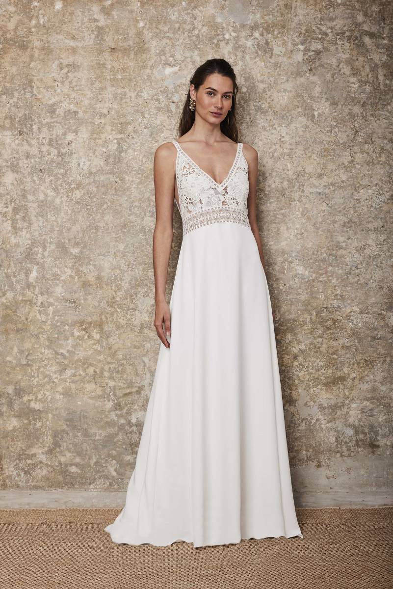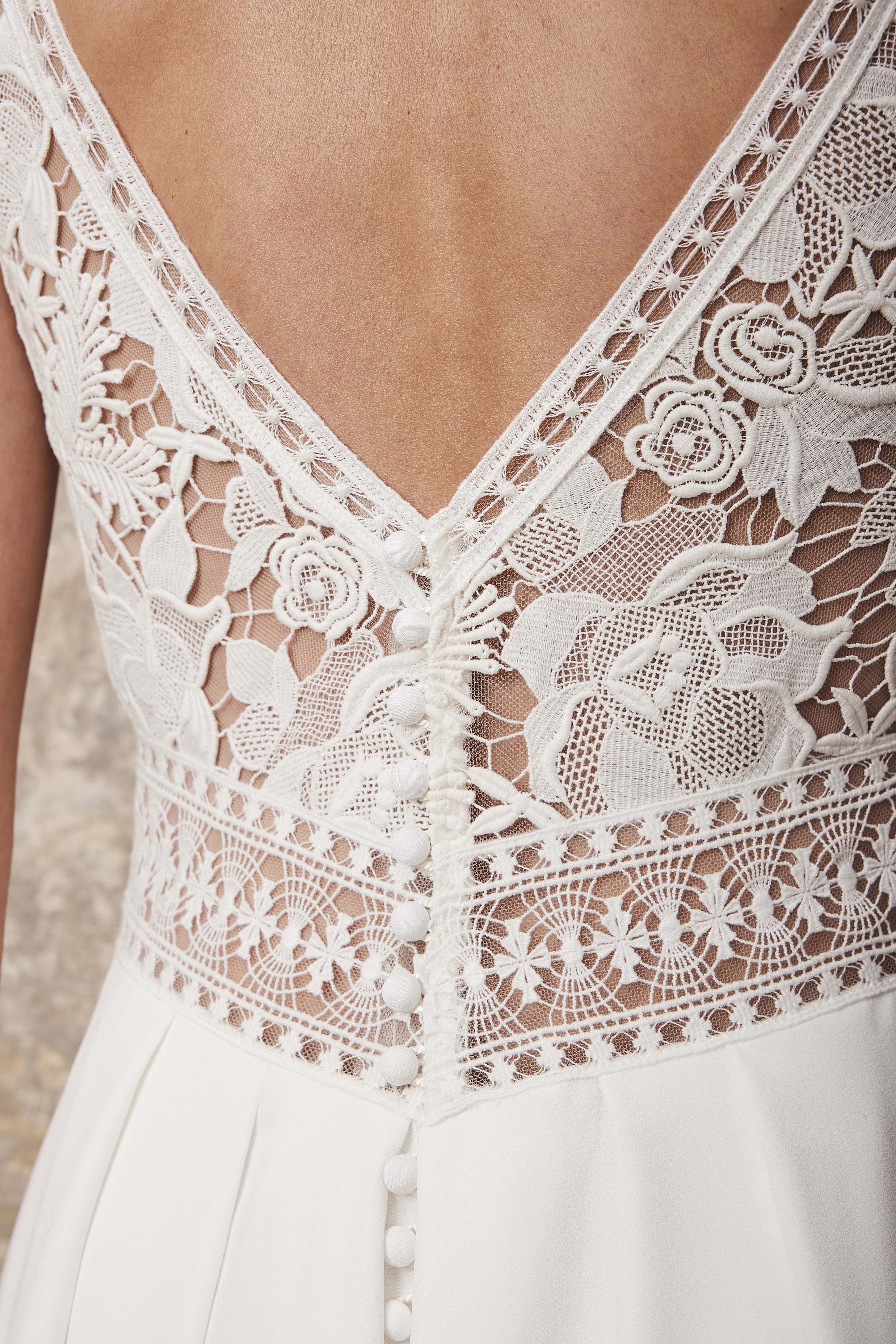 La robe de mariée Ligie se distingue par un subtil mélange de guipure et de macramé, apportant une touche bohème et raffinée à votre grand jour. Ce mariage de textures et de motifs crée une robe unique, parfaite pour les mariées qui cherchent à allier élégance et originalité.