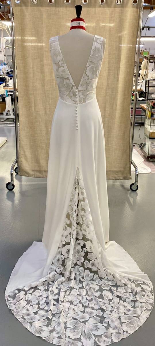 Ce qui fait la beauté de cette robe de mariée, c'est le choix de ses matières nobles : un crêpe au tombé impeccable fluide et délicat, associé à un organza de soie façonné qui apporte une texture unique et un volume subtil. L'organza sculpté dessine des motifs en relief qui créent un jeu de lumière fascinant, donnant à la robe un caractère architectural.