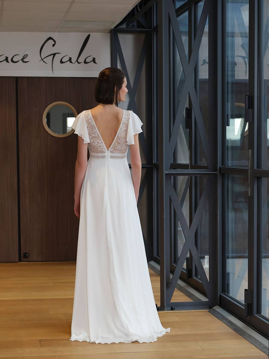 La singularité de la robe de mariée Agathe réside dans l'alliance sublime de la dentelle de Calais et du crêpe georgette. La dentelle de Calais, reconnue mondialement pour sa délicatesse et la finesse de ses motifs, habille avec poésie le bustier ou les manches, apportant une touche de romantisme aérien. Le crêpe georgette, quant à lui, confère à la robe de mariée un tombé fluide et une légèreté vaporeuse, assurant une allure gracieuse à chaque mouvement.