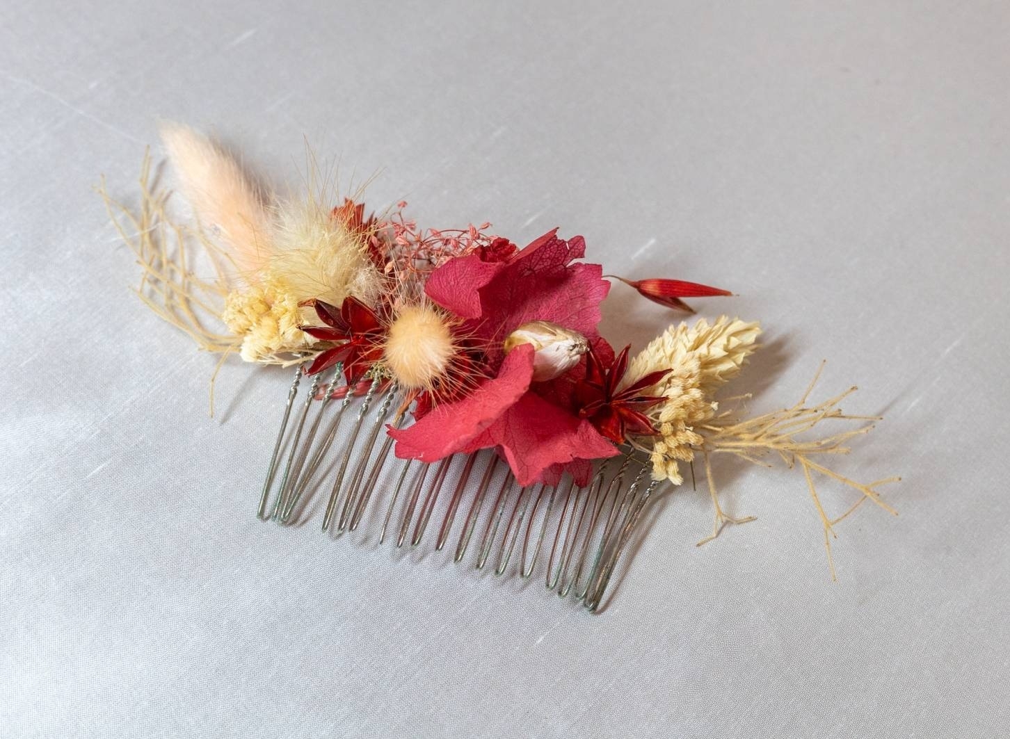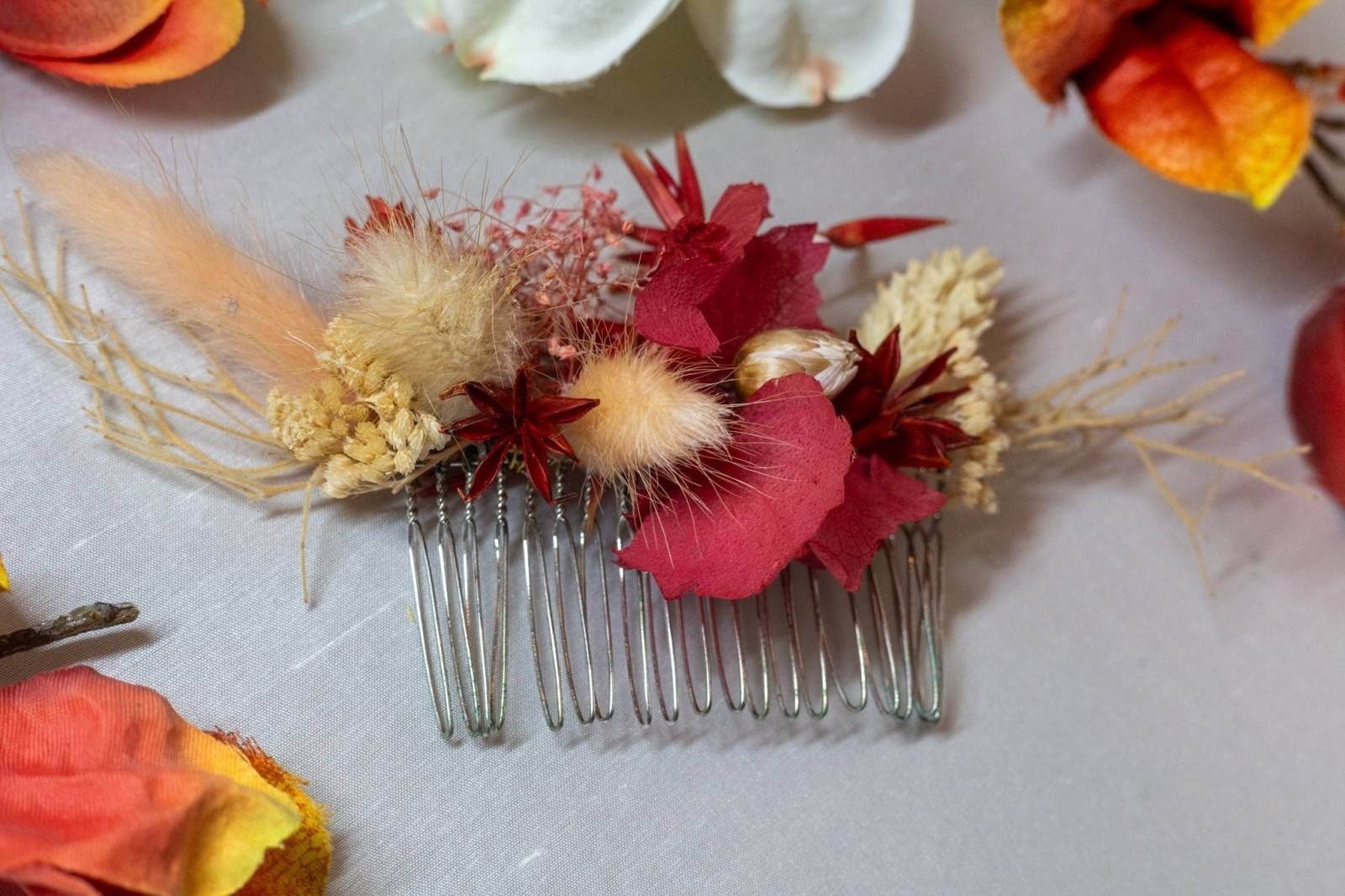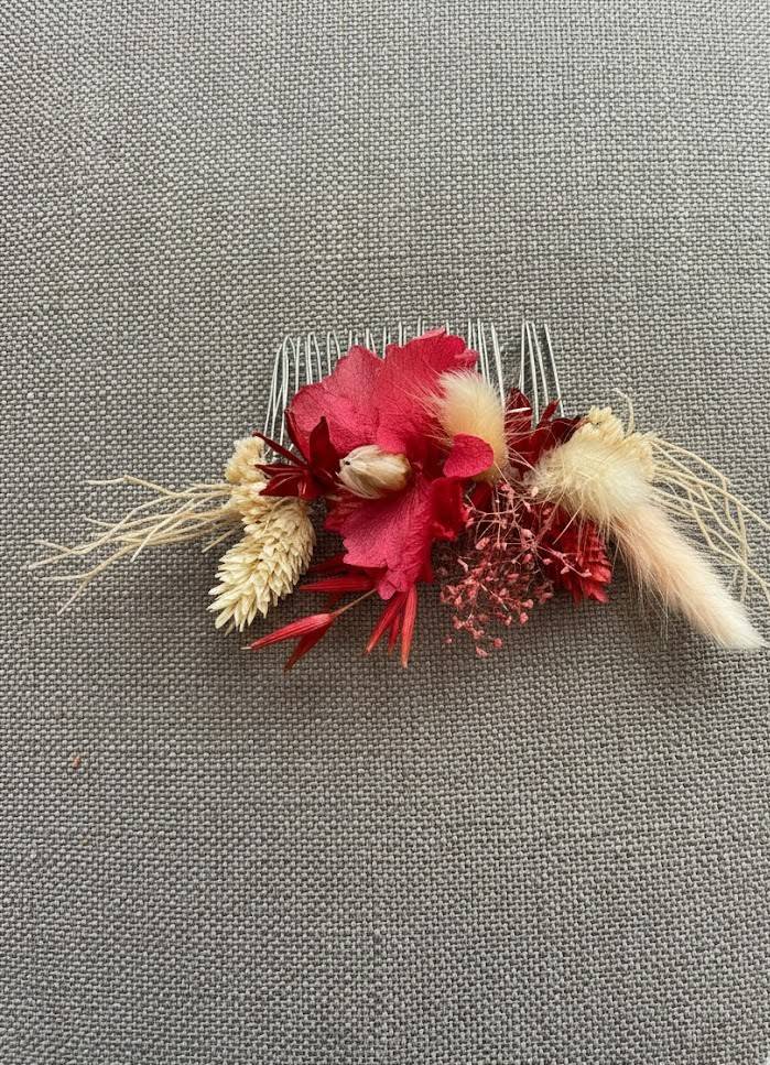 Succombez au charme authentique et passionné de notre peigne Paula, une création artisanale qui capture l'essence d'un été éternel. Ce bijou de tête, aux nuances vibrantes de rouge et de blé, est l'accessoire idéal pour celles qui souhaitent apporter une touche de caractère et de chaleur à leur coiffure de fête.