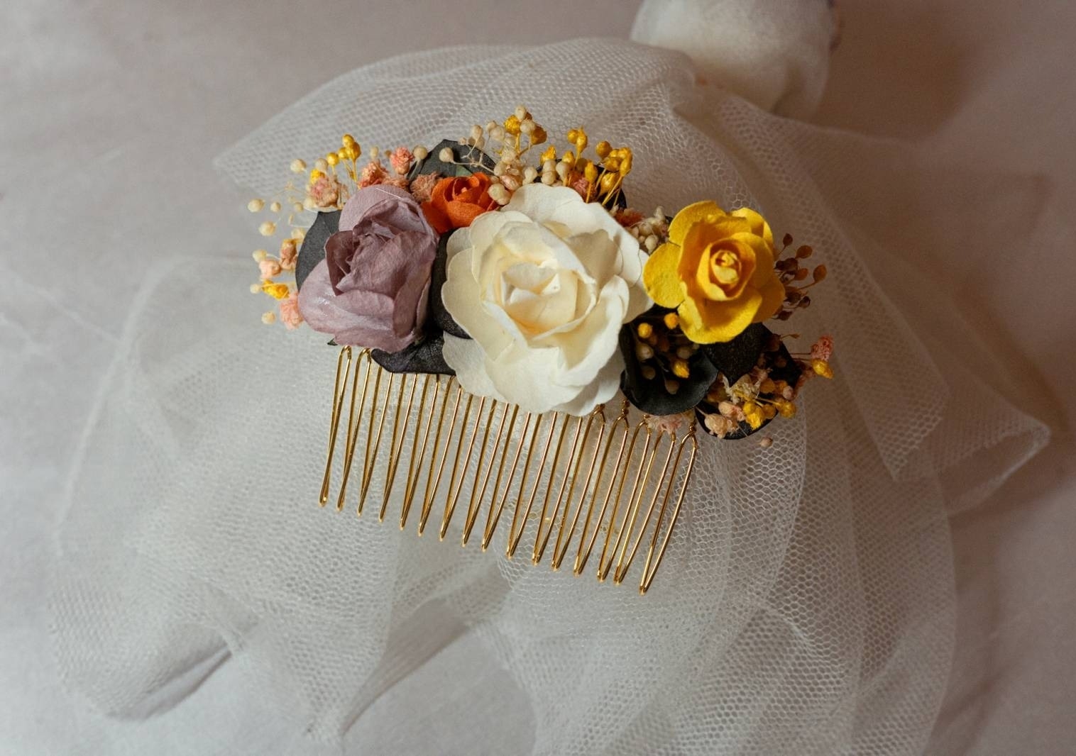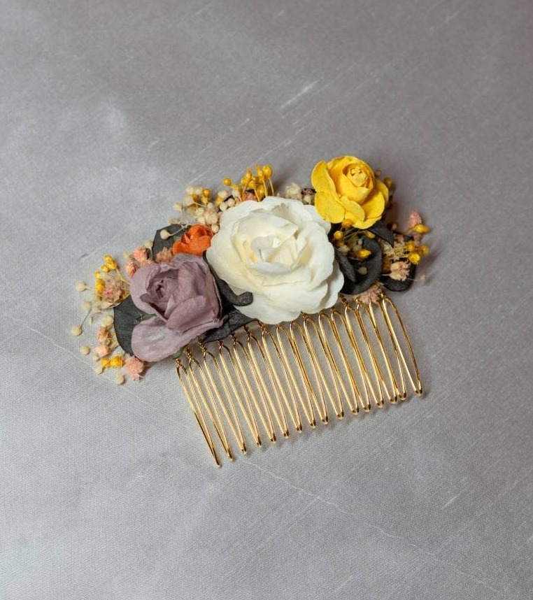 Peigne en fleurs séchées pour mariées et invitées Croquelune, parfait pour compléter vos tenues de mariages et s'assortir aux couleurs de votre tenues.