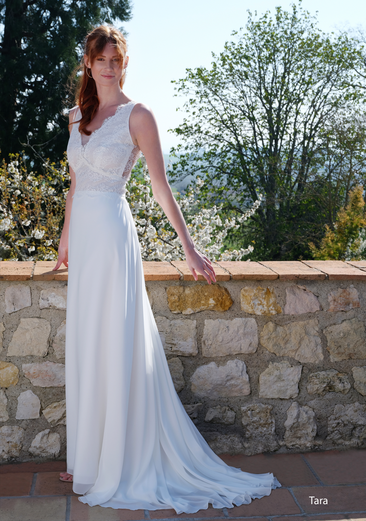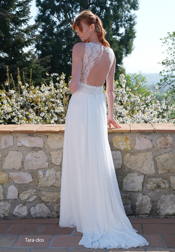 Le modèle Tara Mousseline de la maison Bochet est l’incarnation de la grâce aérienne. Conçue pour la mariée qui rêve d’une silhouette vaporeuse, cette robe se distingue par l’utilisation de la mousseline, un tissu d’une finesse absolue qui ondule au moindre mouvement. Avec son tombé fluide et son allure presque impalpable, Tara Mousseline offre une esthétique à la fois romantique et épurée. C'est la robe idéale pour un mariage en plein air, une cérémonie sur la plage ou toute union placée sous le signe de la douceur et de la liberté.